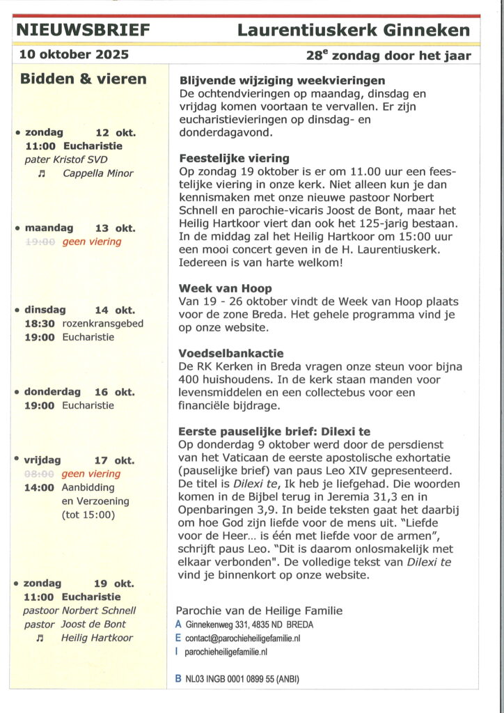 Hierbij de Nieuwsbrief voor de komende week met daarin onder meer extra aandacht voor een feestelijke viering op zondag 19 oktober.