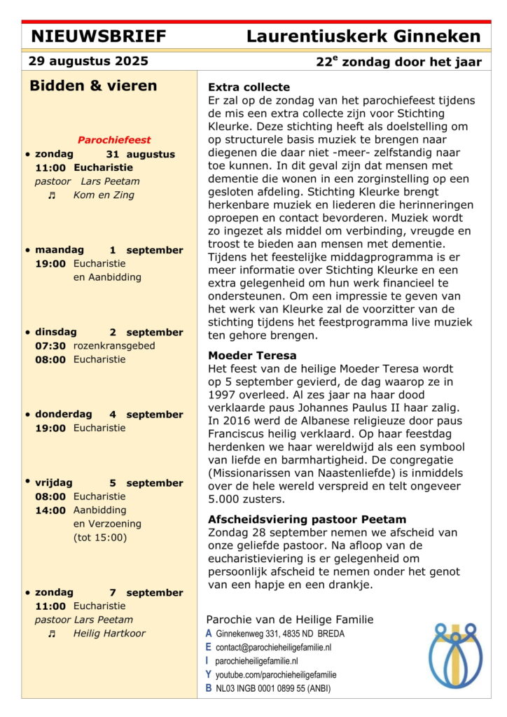 Hierbij de nieuwe Nieuwsbrief voor de komende week met extra aandacht voor de afscheidsviering van onze pastoor op 28 september.